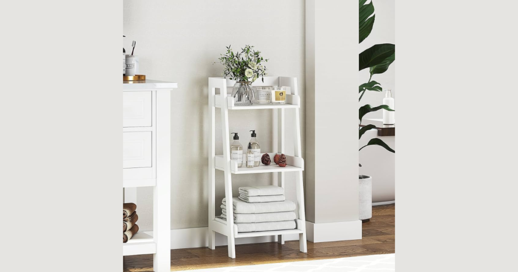 Ladder shelf units lean against walls and save space. They provide vertical tiers for towels and decor. I like their open and airy feel.