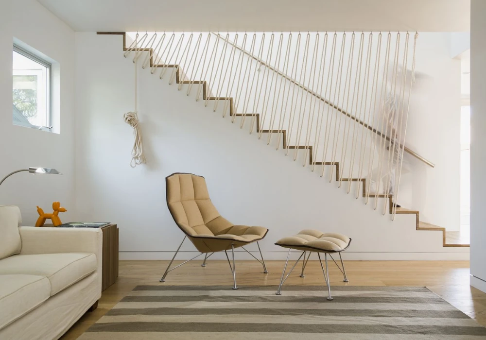 For a more creative and budget-friendly solution, consider installing a rope railing on your stairs. This rustic, coastal-inspired design is ideal for homeowners looking for a unique, laid-back look.