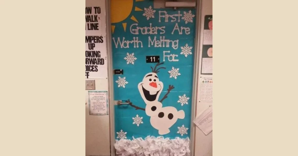 Winter-themed classroom doors often include snowflakes, snowmen, and icy blue colors. Teachers use simple craft paper decorations.